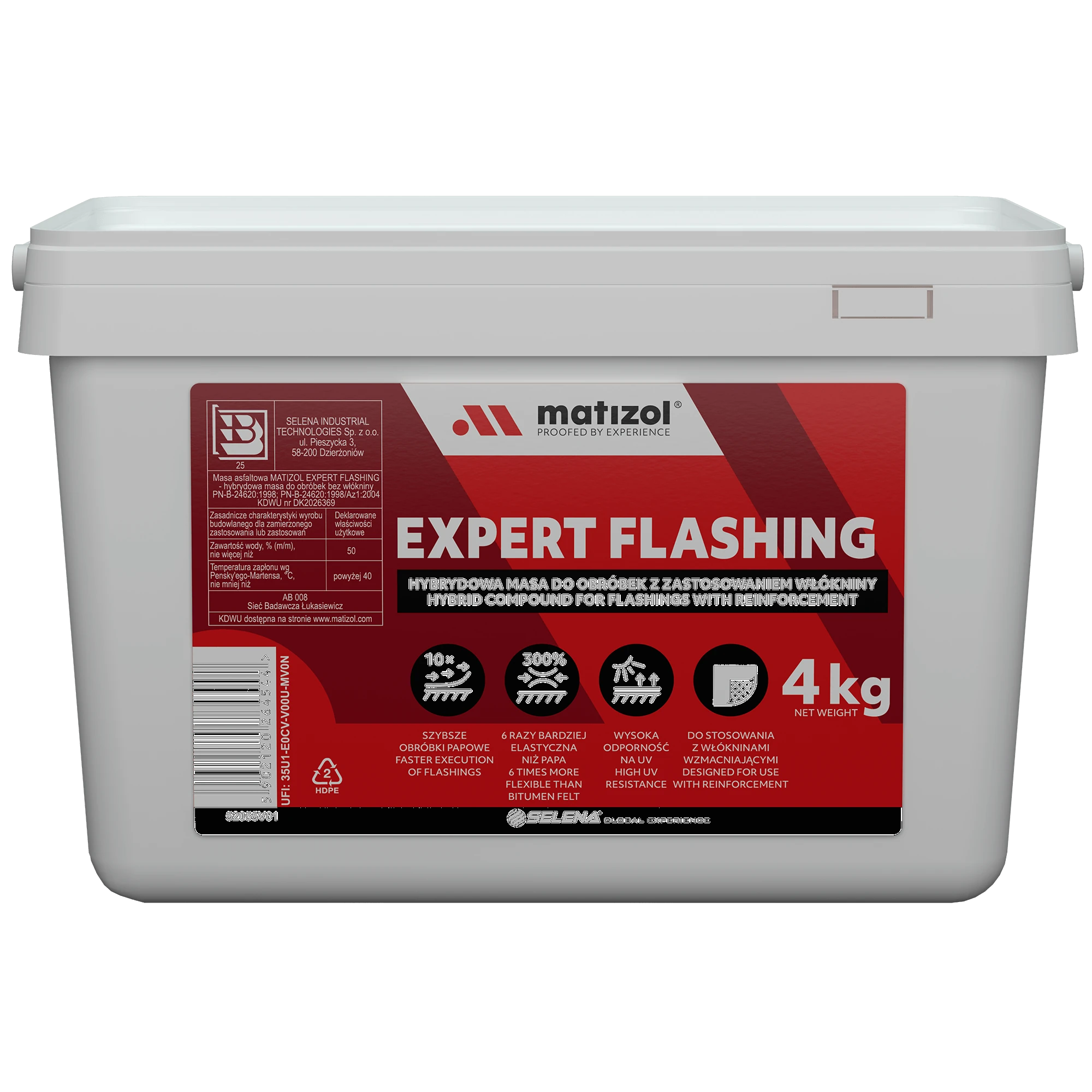 Zastępuje z powodzeniem tradycyjne obróbki z papy będące najbardziej czasochłonnym elementem podczas instalacji pokryć dachowych. Wykonanie obróbek przy użyciu masy MATIZOL MASTER Flashing zajmuje ponad 10 razy mniej czasu w porównaniu do tradycyjnych metod. Produkt charakteryzuje się doskonałą przyczepnością do szerokiego zakresu materiałów budowlanych: papy bitumicznej, betonu, drewna, blachy (w tym powlekanej i ocynkowanej), ceramiki, aluminium, PVC i styropianu. Wyróżnia się również wysoką odpornością na zmienne warunki atmosferyczne, promieniowanie UV oraz wodę stojącą, co czyni go idealnym rozwiązaniem do zastosowań zewnętrznych.